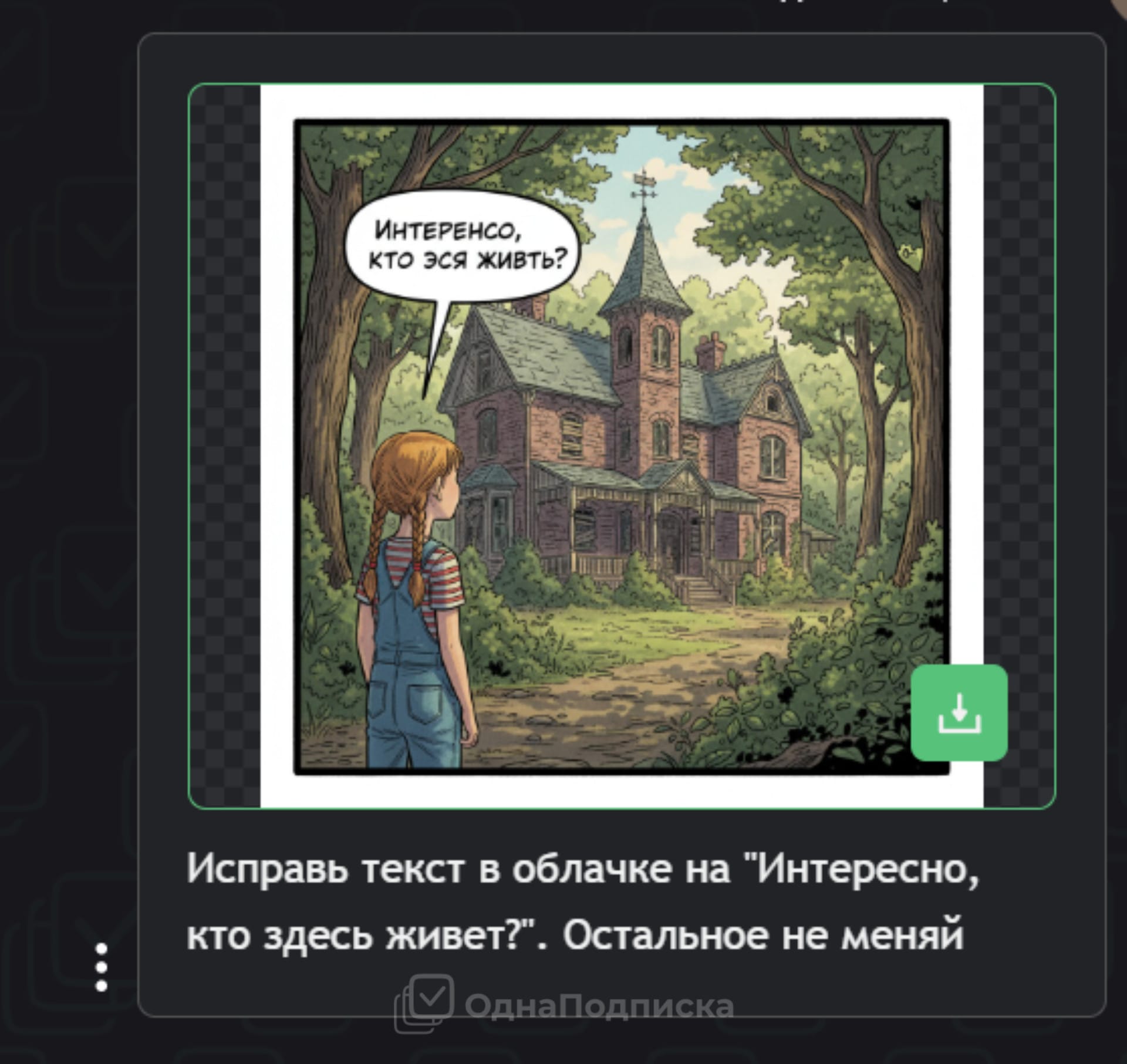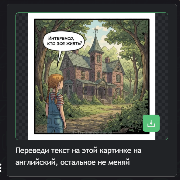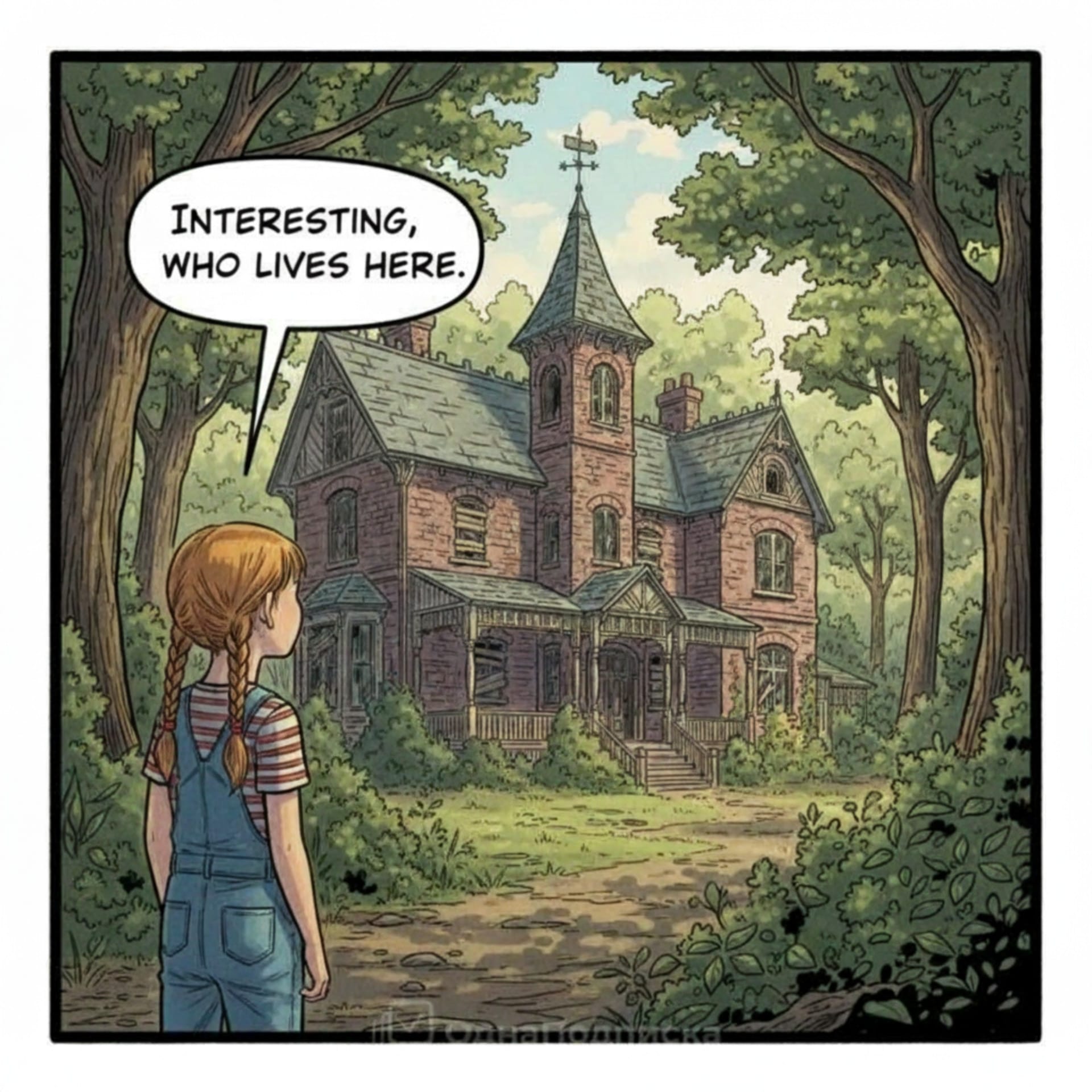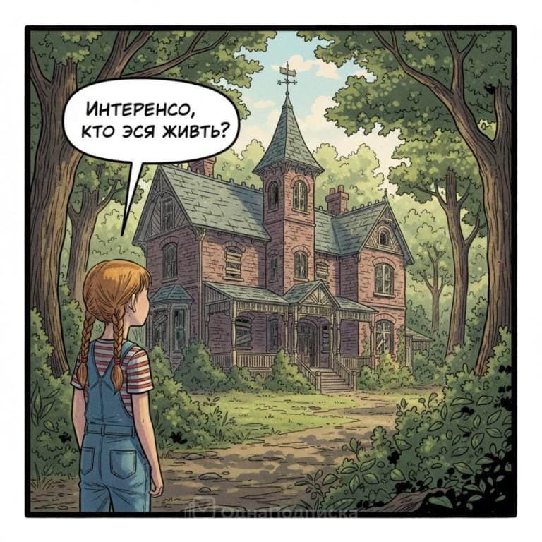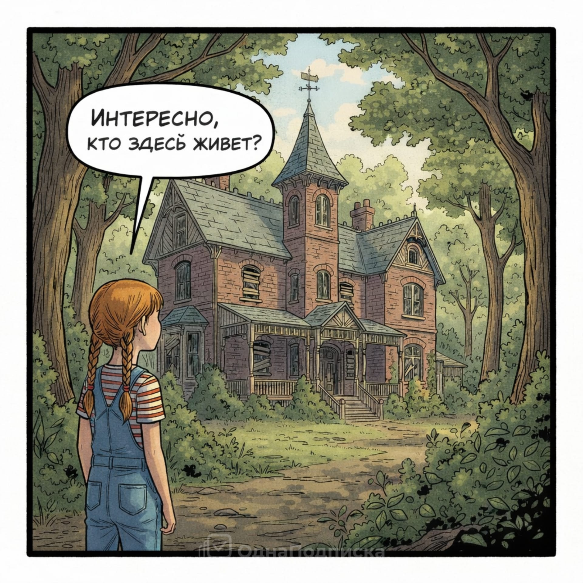 - Первый кадр: "Нарисуй первый кадр комикса: девочка с косичками стоит перед старинным домом. В речевом облаке текст 'Интересно, кто здесь живет?'"