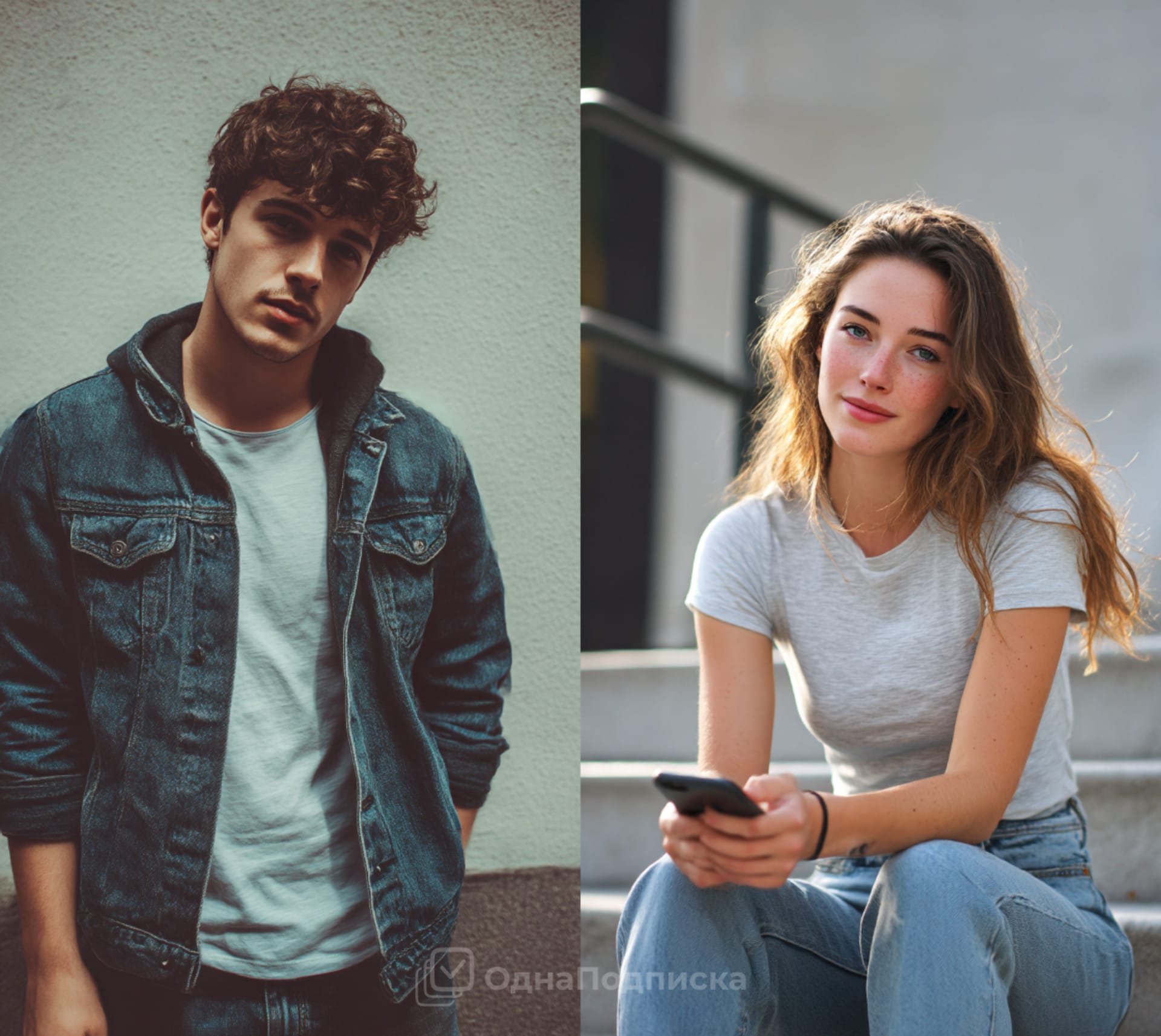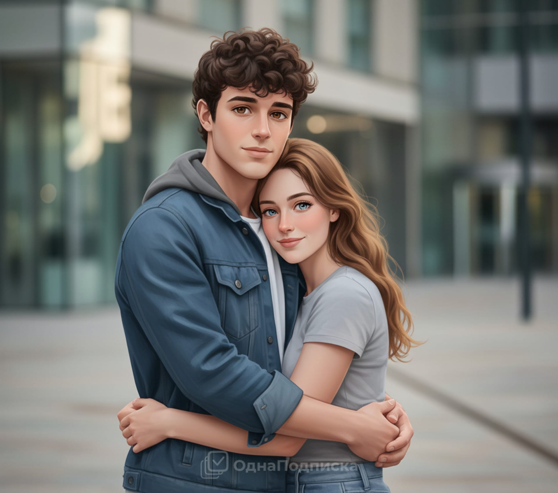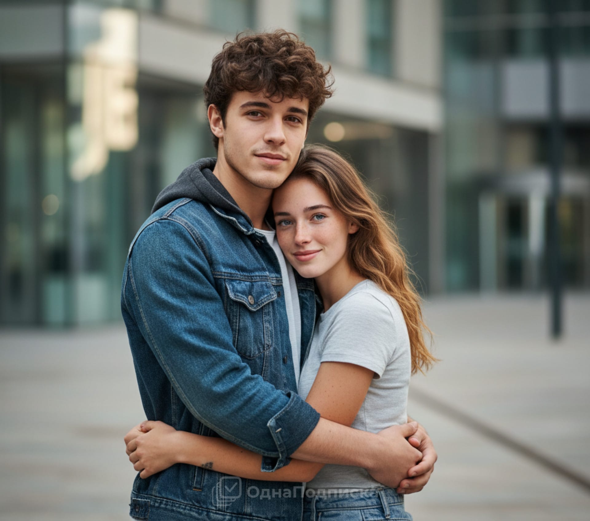 Размести этих парня и девушку рядом, так, чтобы они были в обнимку на совместной фотографии. Используй единое освещение: мягкий, нейтральный дневной свет, естественные тени. Убедись, что они выглядят как на одном фоне, а не как часть коллажа. Нейтральный городской фон, фотореализм. Сохрани реалистичные черты лиц, текстуры кожи и одежду.