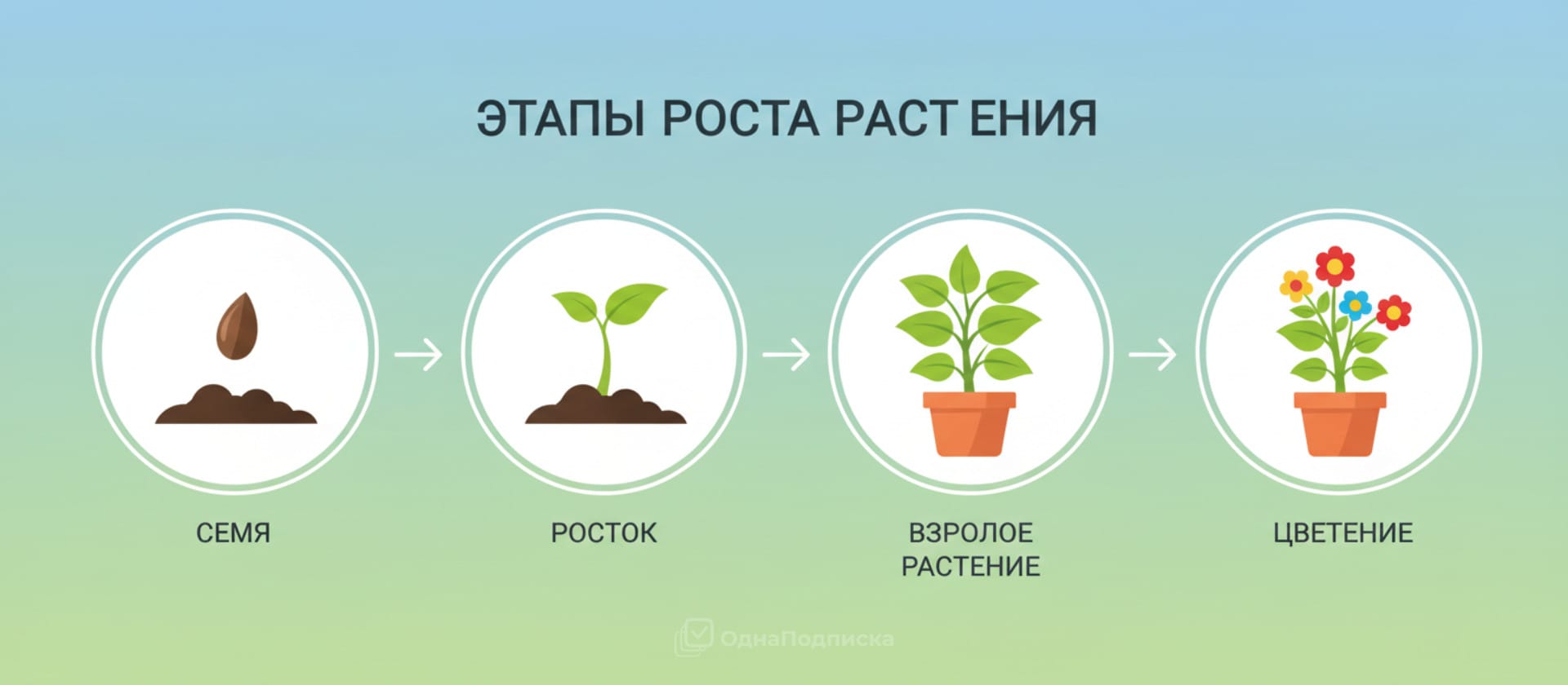 "Создай инфографику 'Этапы роста растения' с 4 стадиями: семя, росток, взрослое растение, цветение. Под каждой стадией подпись на русском языке"